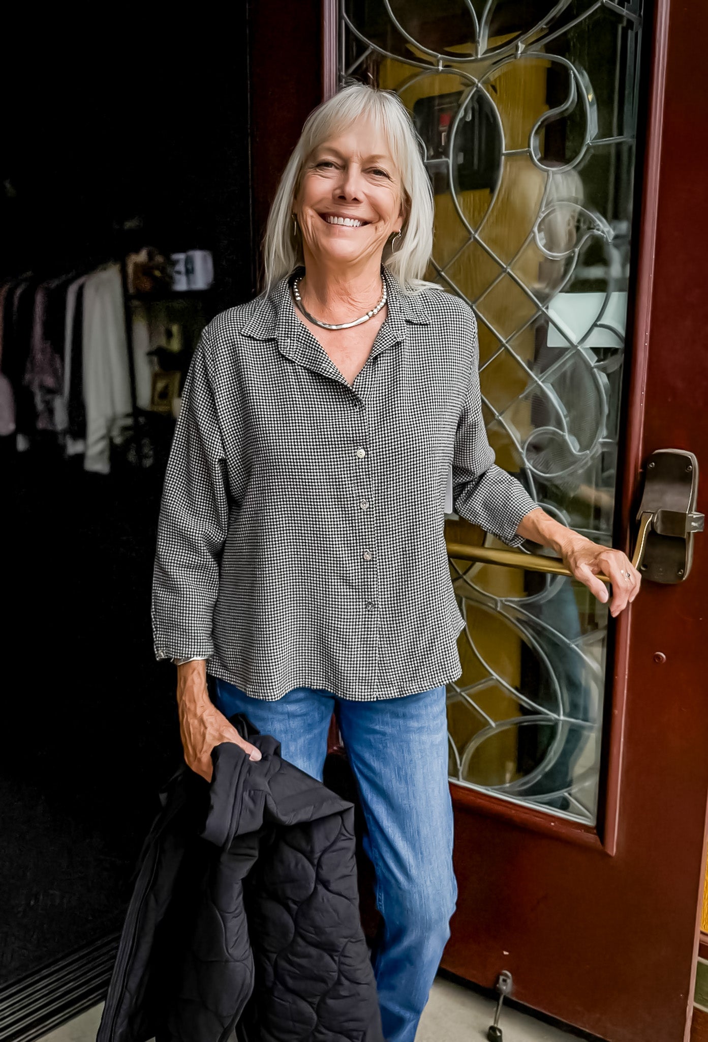 Collared button front shirt with hi low hem and pleat button detail on cuff in a mini check pattern.