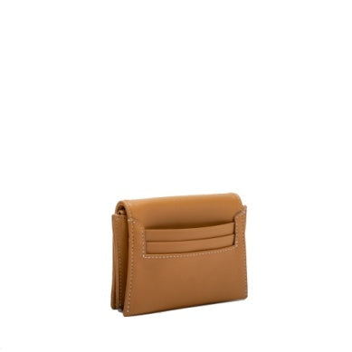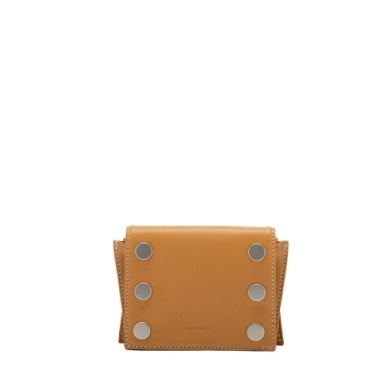 - Exterior Features: front facing rivets, flap closure with snaps, angled side wings, 3 CC slots on back, blind embossed logo, gusseted body