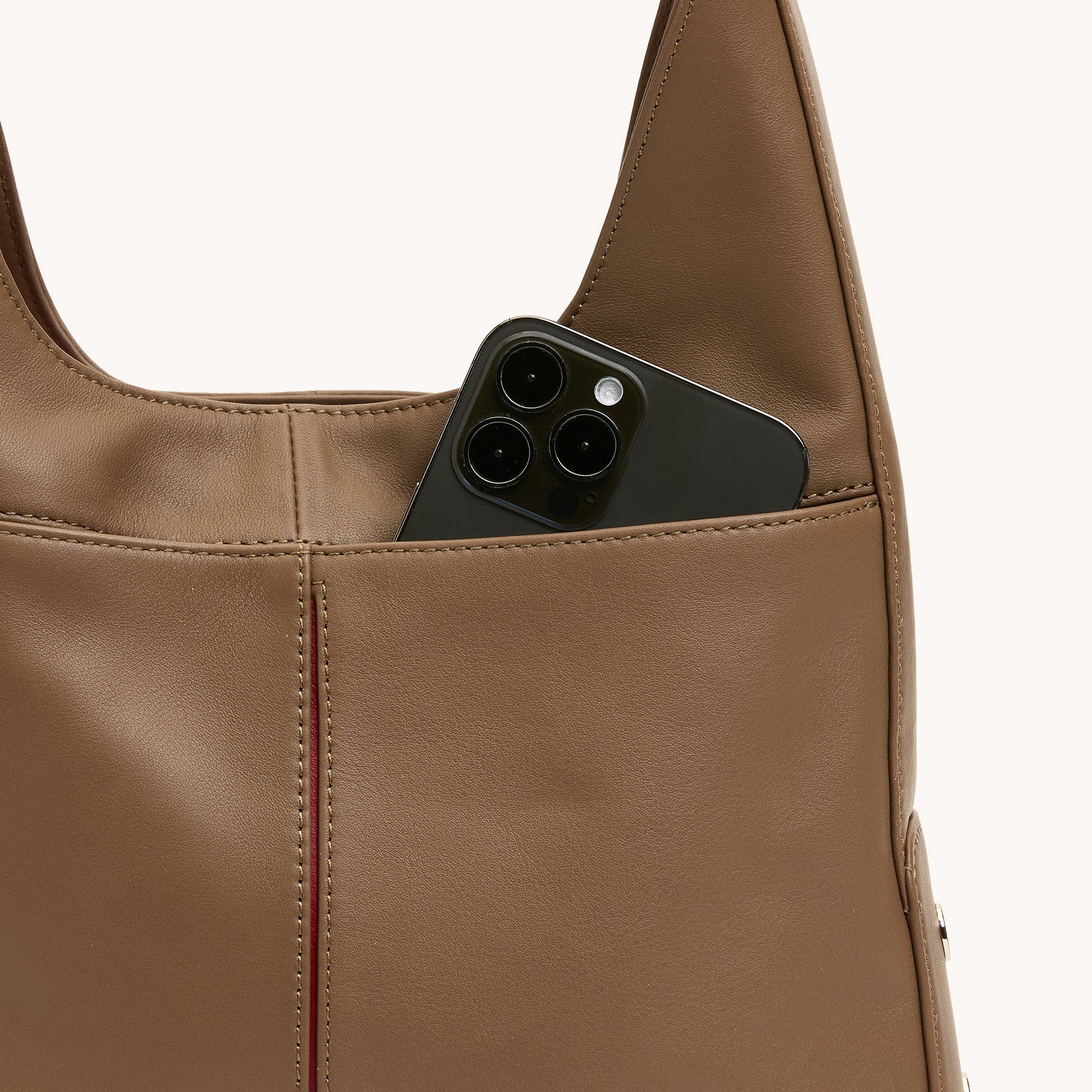 - Exterior: Subtle back pocket, decorative O ring, rivets and red reveal line