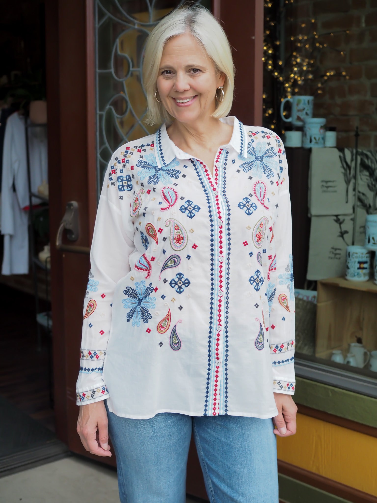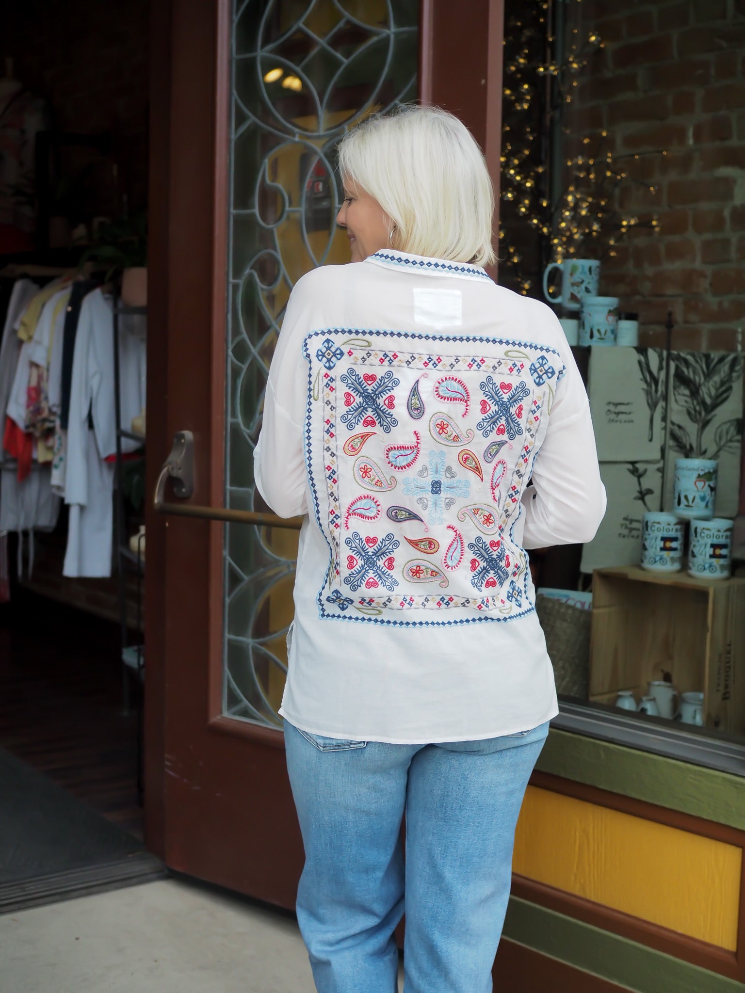 Relaxed fit collared button front shirt with long sleeves and slit detail at sides embellished with embroidery.