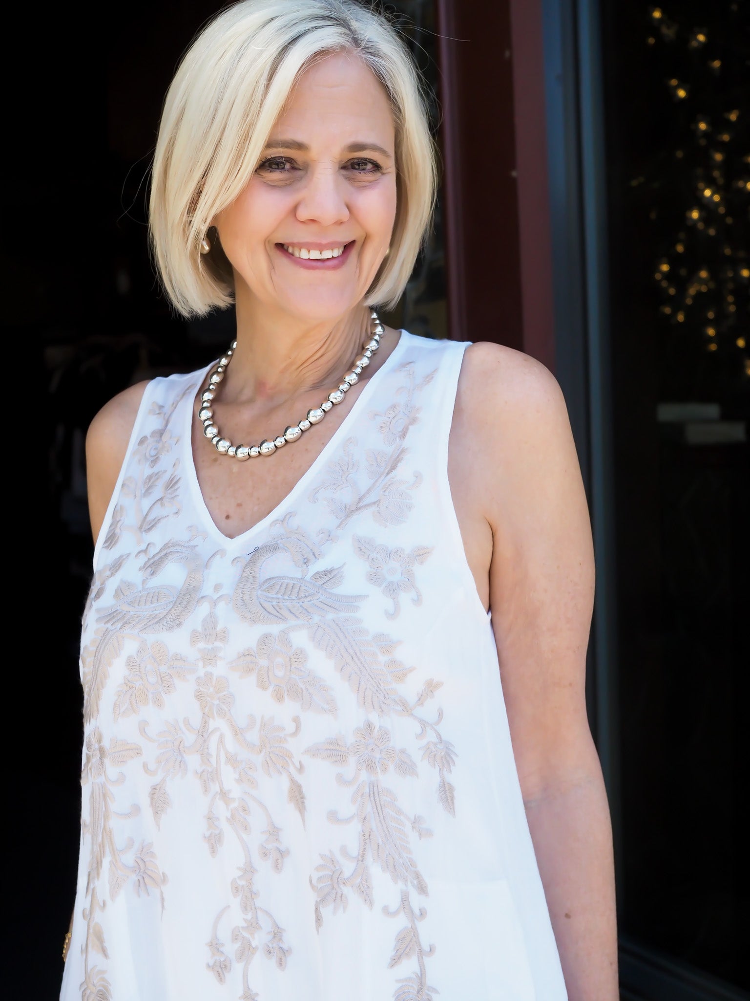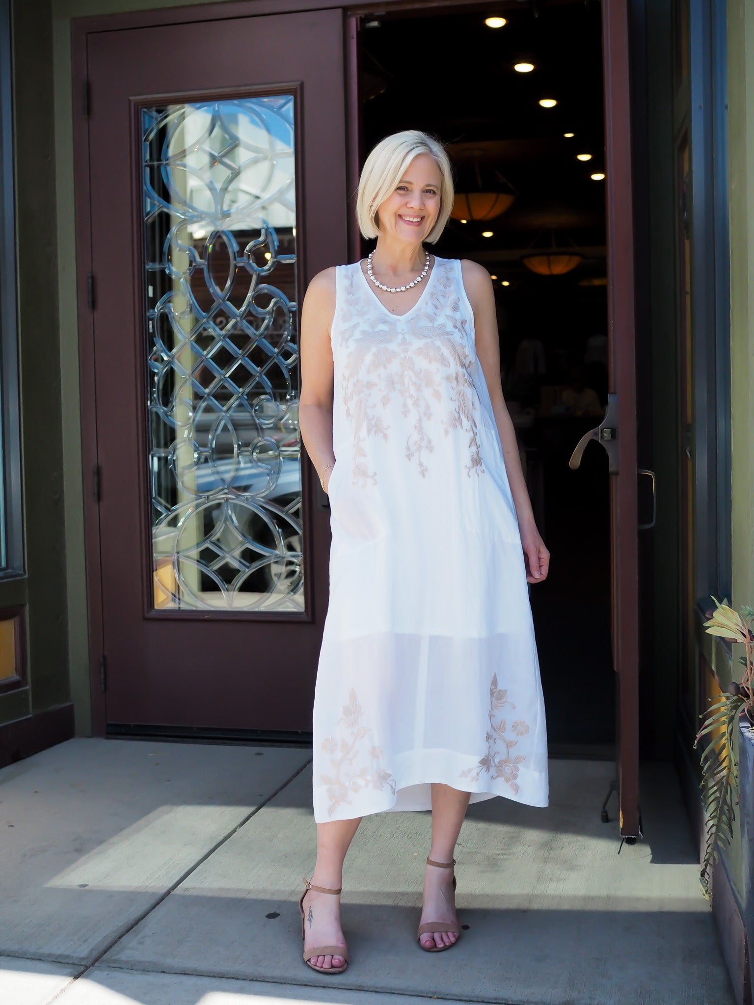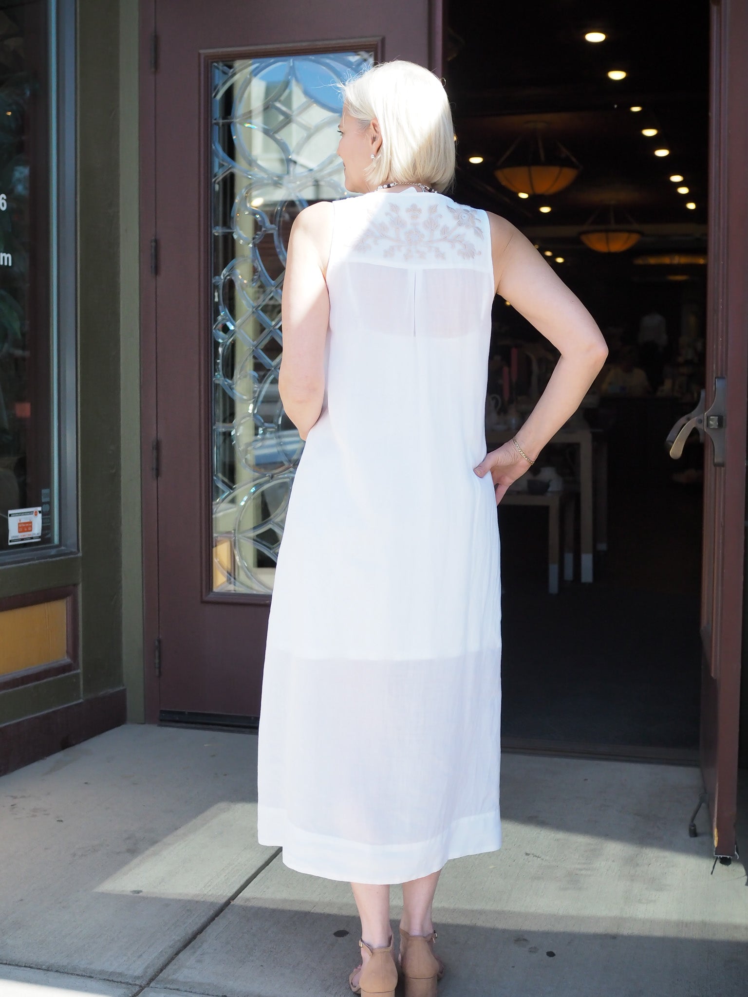 Relaxed fit midi length cotton tank dress with V-neckline and a back yoke with a box pleat in a tone-on-tone embroidered floral design. Slip included