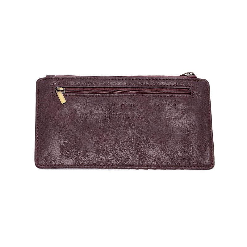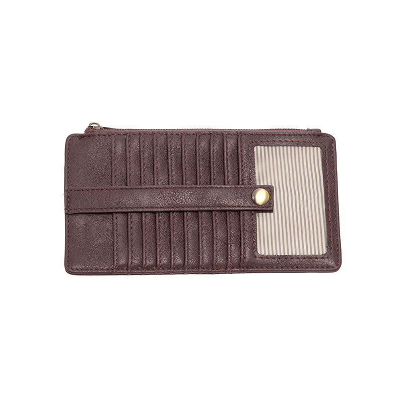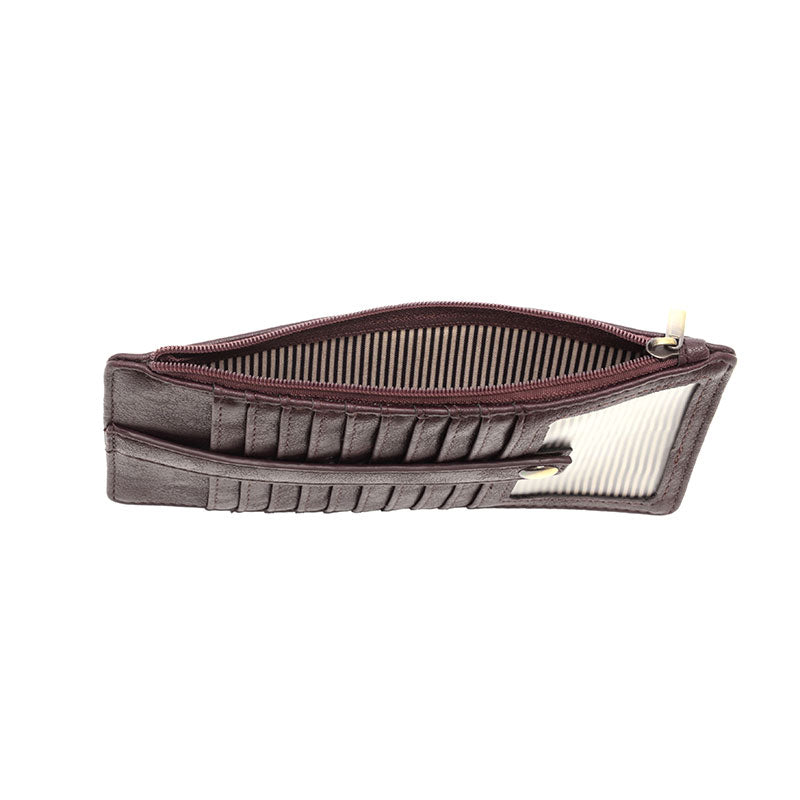 - This slim and sleek card wallet has 9 credit card pockets, an ID window, zippered change pocket and zippered billfold pocket all in casual distressed Vegan Leather.