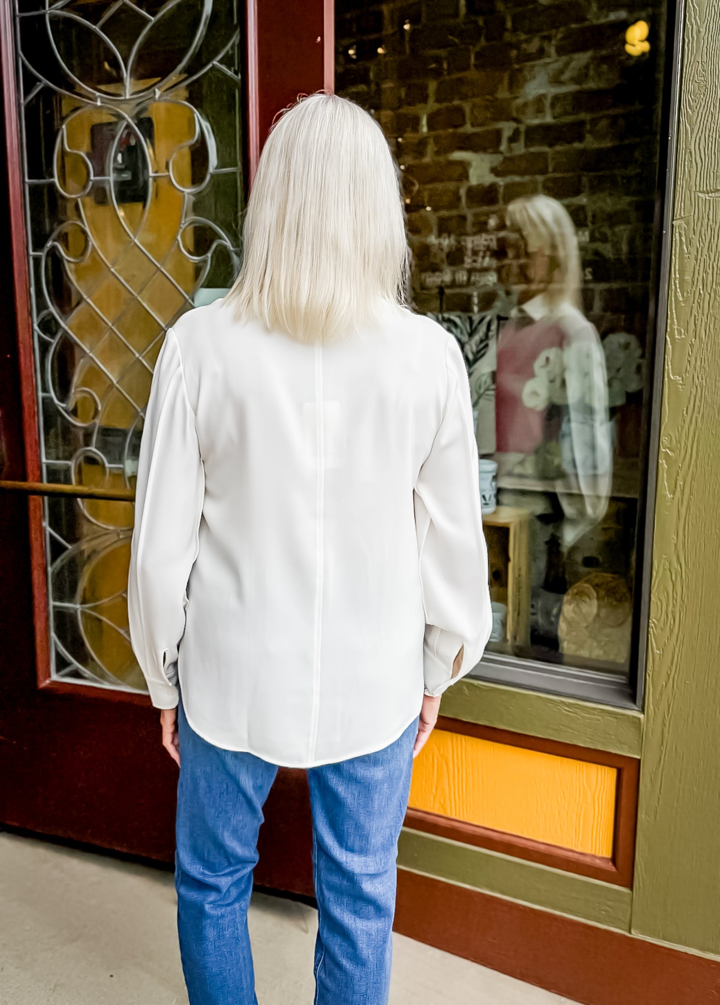Collared button front blouse with pleated long balloon sleeves and rounded hem.