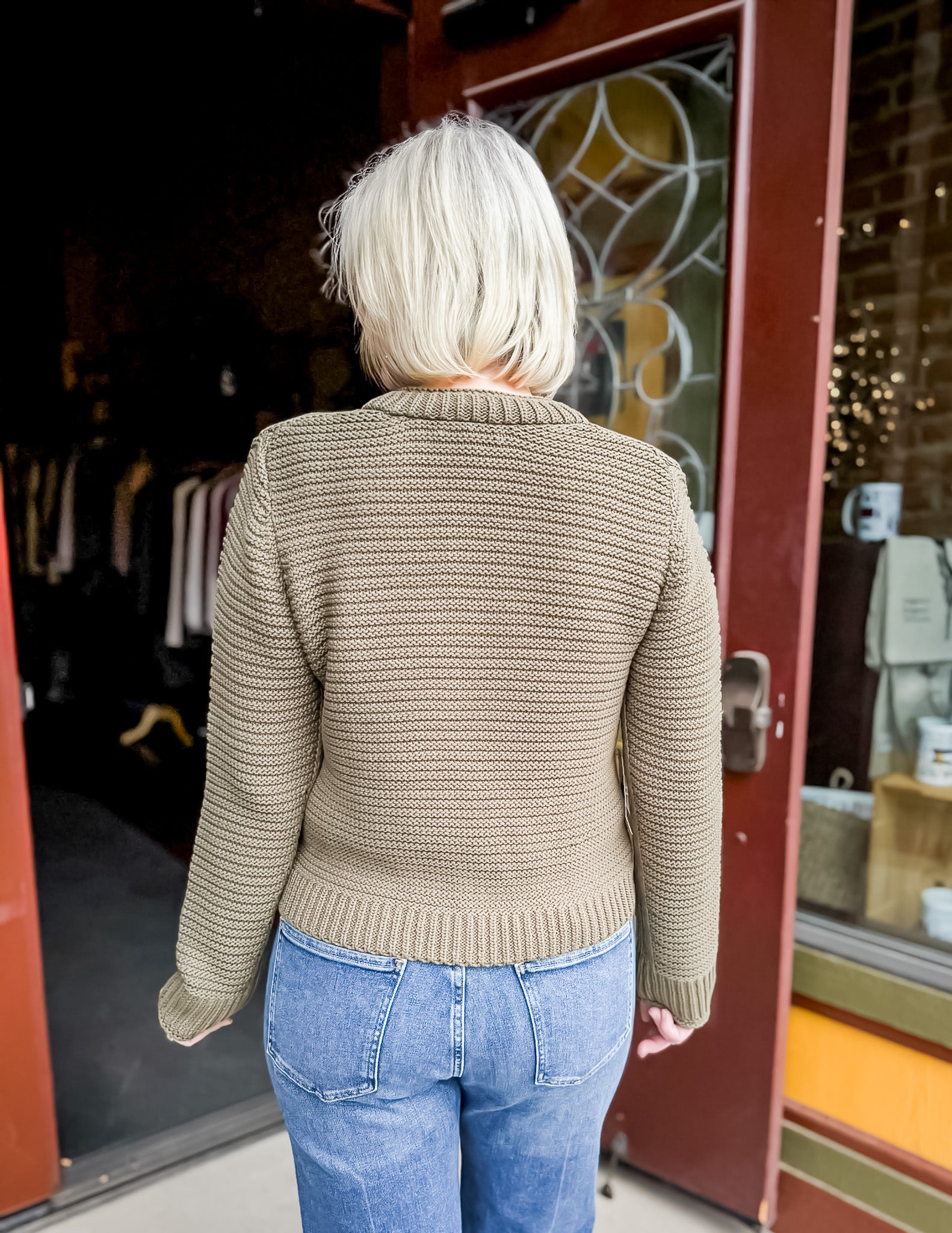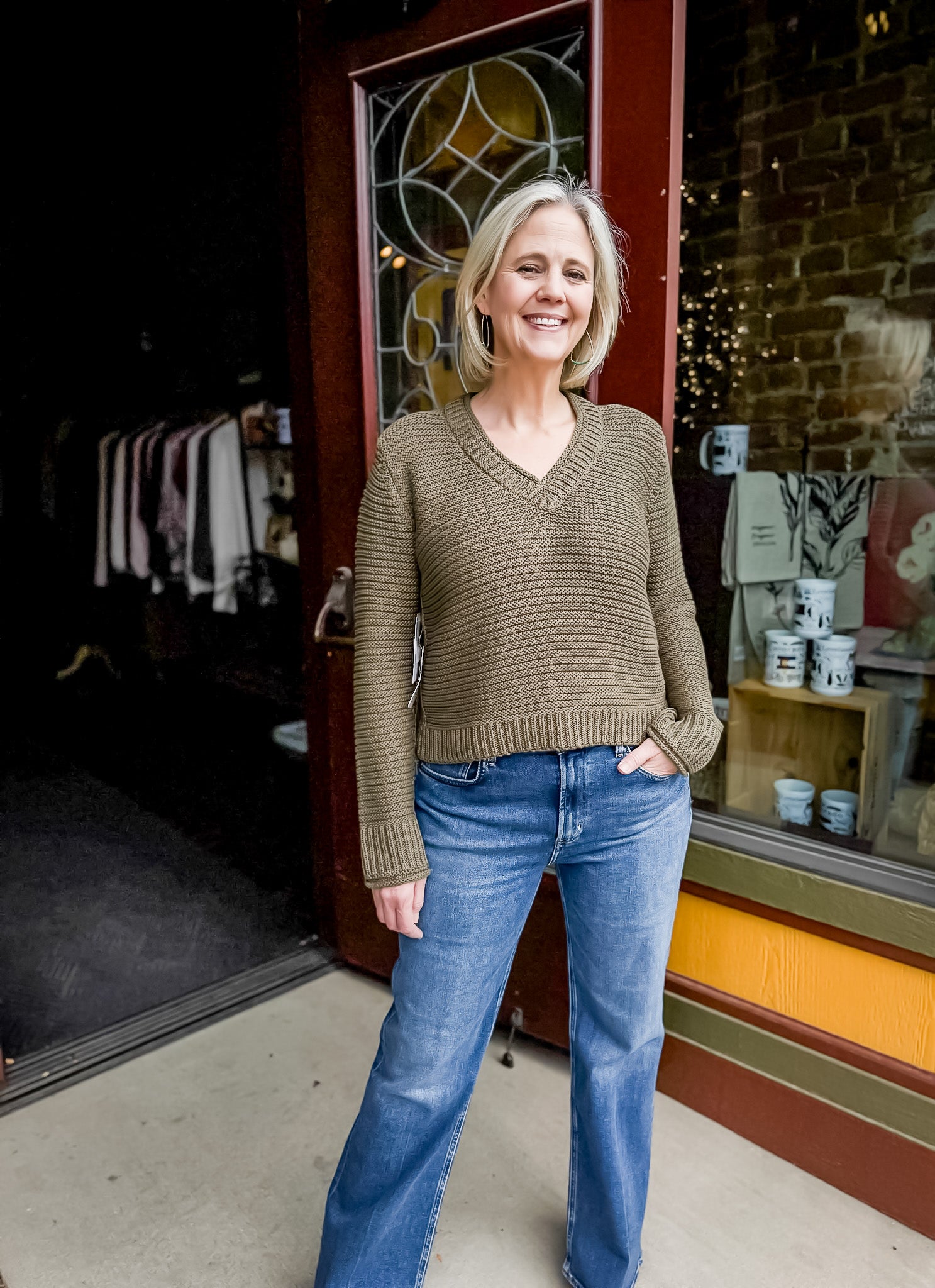 Classic V-neck sweater with ribbing at neckline and cuff in a striped pattern.