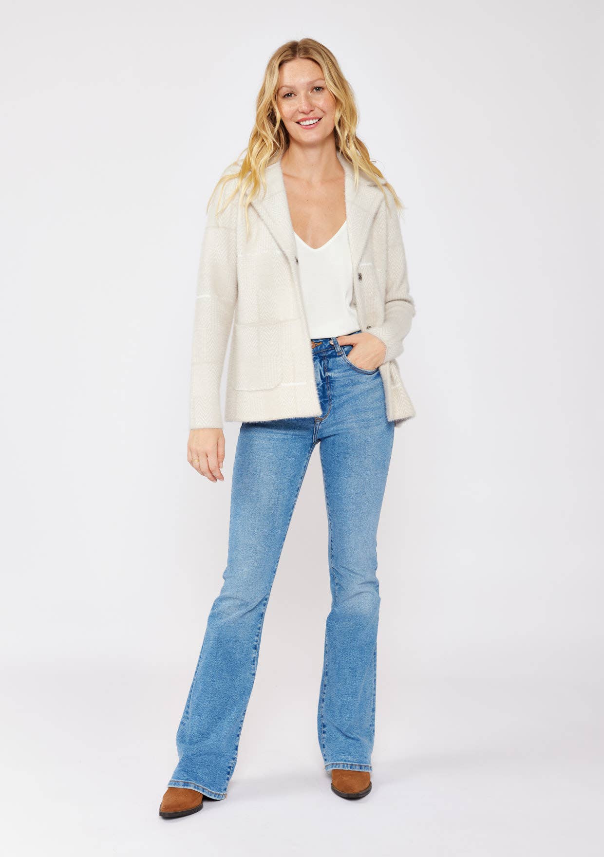 Long-sleeve blazer sweater has a notch collar and stylish plaid pattern, with hidden snaps for a polished look, perfect for effortless autumn layering. It includes front patch pockets for added convenience.