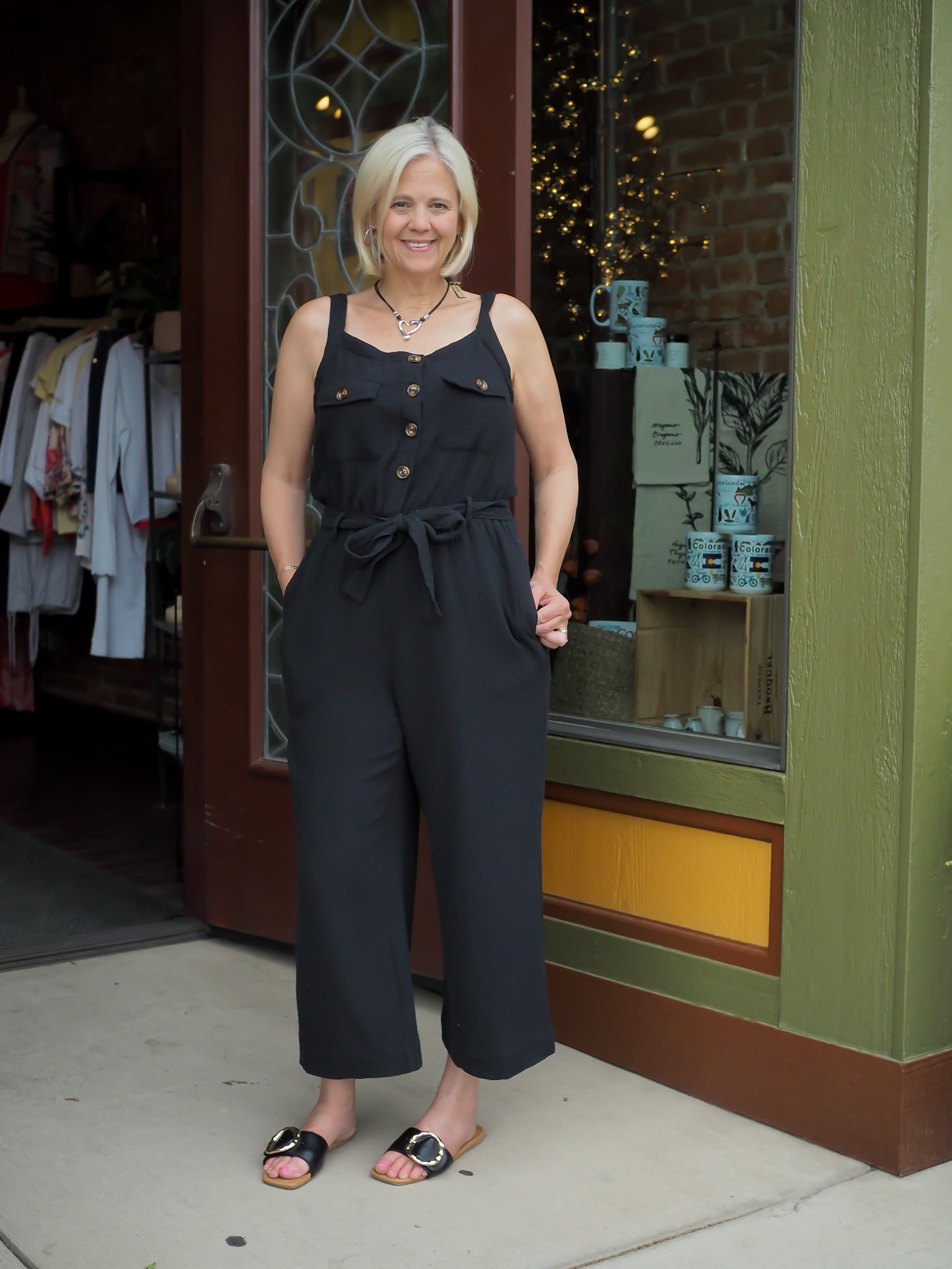 Relaxed fit button front jumpsuit with front pockets and belted sash in a crinkle cotton gauze.