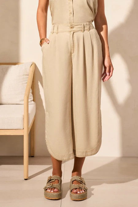 Flowy pleated pant with zip closure, tulip hem, and pockets.