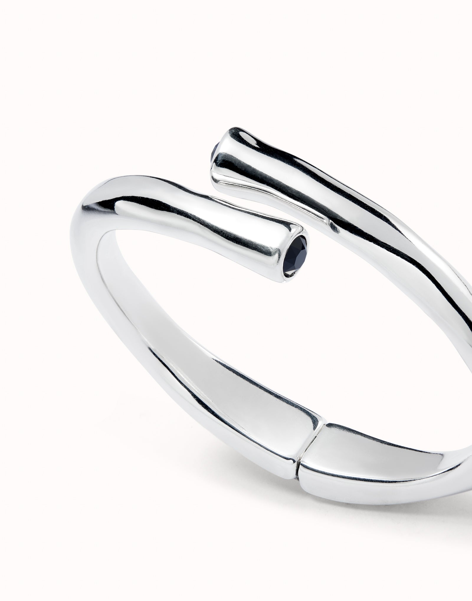 Rigid sterling silver-plated bracelet with faceted black crystal detail at the ends. Made in Spain with a 100% handmade process. Genderless jewelry collection that combines leather with tube-shaped, silver-plated and organic finish pieces. Discover the collection ser natural.